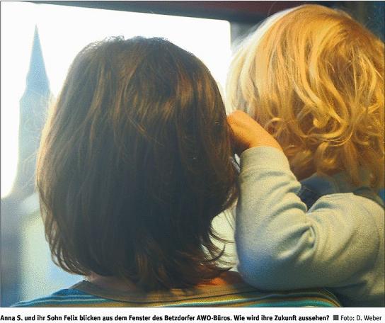 Und dann Felix. “Der Junge ist sehr genügsam”, sagt Anna S., und dennoch hat auch er, der seit dem Sommer in den Kindergarten geht, seine kleinen und großen Wünsche. Nächstes Jahr will der Kleine Fußball spielen, da müssen Trikot und Schuhe her. Eine Mitbewohnerin aus dem Mietshaus hat dem Jungen zuletzt eine schicke Weste gestrickt, ansonsten müssen sich Mutter und Sohn irgendwie durchschlagen. Sonntags gehen die beiden schon mal zum “Sonntagscafé” oder zur Märchenstunde in die “Gelbe Villa” in Kirchen.